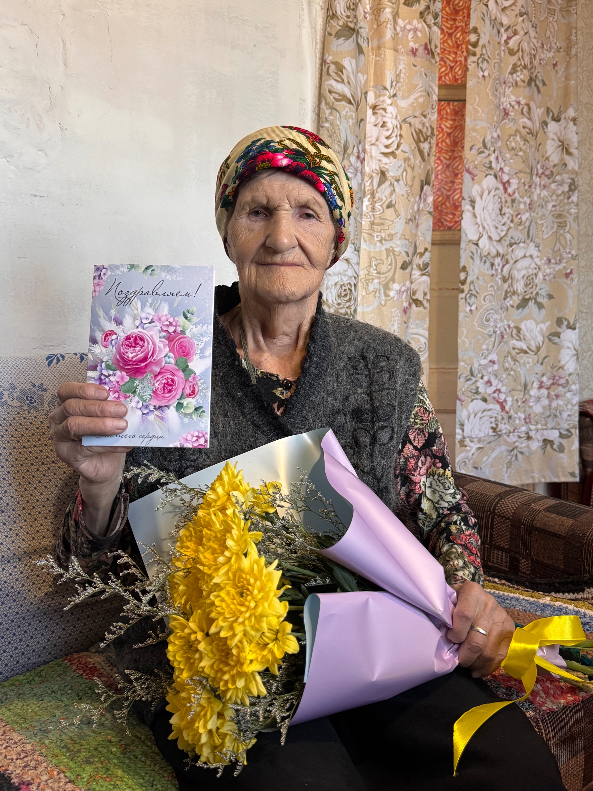 В юбилейный день поздравить именинницу приехали заместитель главы Вытегорского муниципального округа Игорь Перцев и председатели Совета ветеранов Надежда Дмитриева и Галина Костылева. Гости вручили цветы, подарки и пожелали долгих лет жизни.