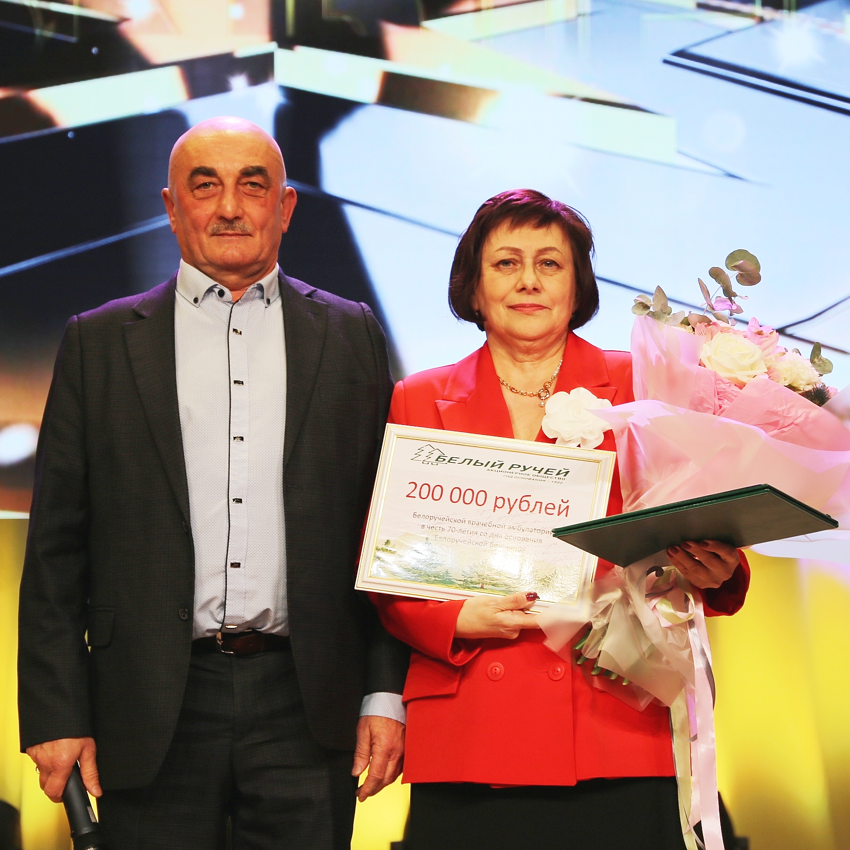 Со сцены в адрес медиков звучали искренние слова благодарности. Председатель первичной профсоюзной организации АО «Белый ручей» Алексей Богачев вручил коллективу сертификат и цветы, подчеркнув: «Ваша миссия поистине бесценна. Вы не только помогаете людям справляться с недугом, но даете им веру в свои силы».