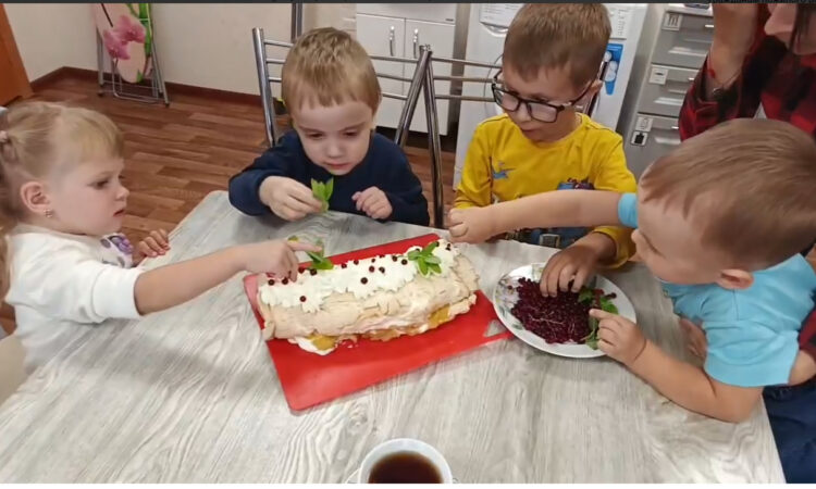 Мамы и дети на кулинарном мастер-классе учились делать меренговый рулет.