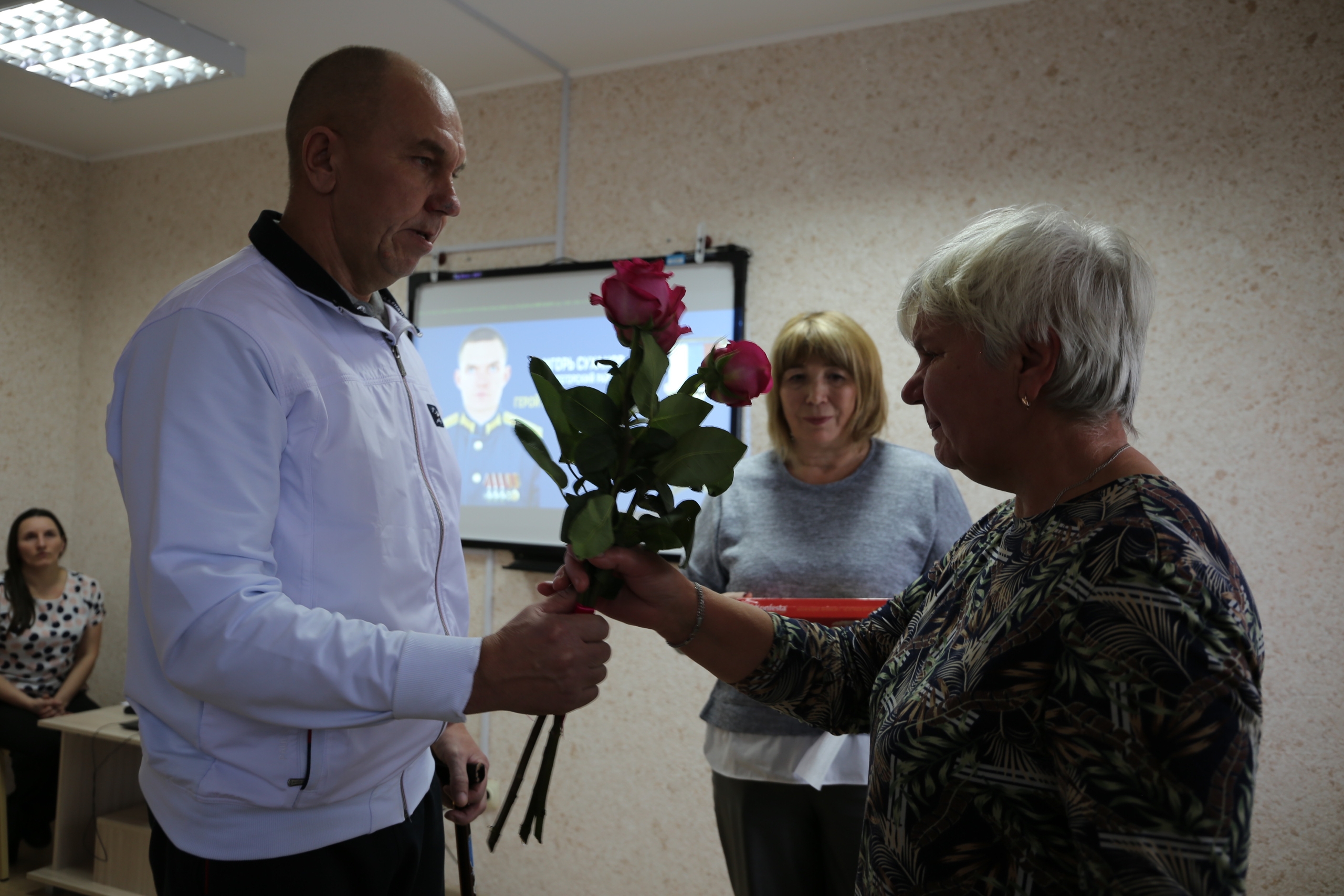«Спасибо вам за вашего сына, за Героя России», — сказал, обращаясь к Вере Александровне, Михаил Крохин и вручил ей цветы. Это был момент глубокой, безмолвной благодарности всех присутствующих.