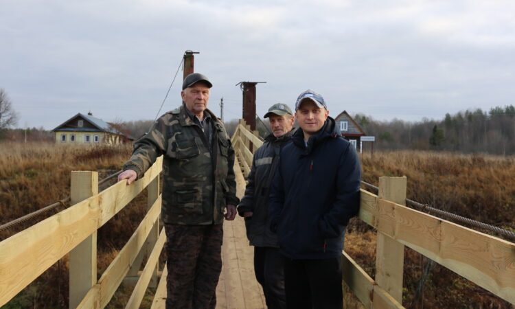 В деревне Каньшино отремонтировали навесной мост На фото слева направо: Юрий Медведев, Евгений Левин, Константин Миньков В Андомском сельском поселении