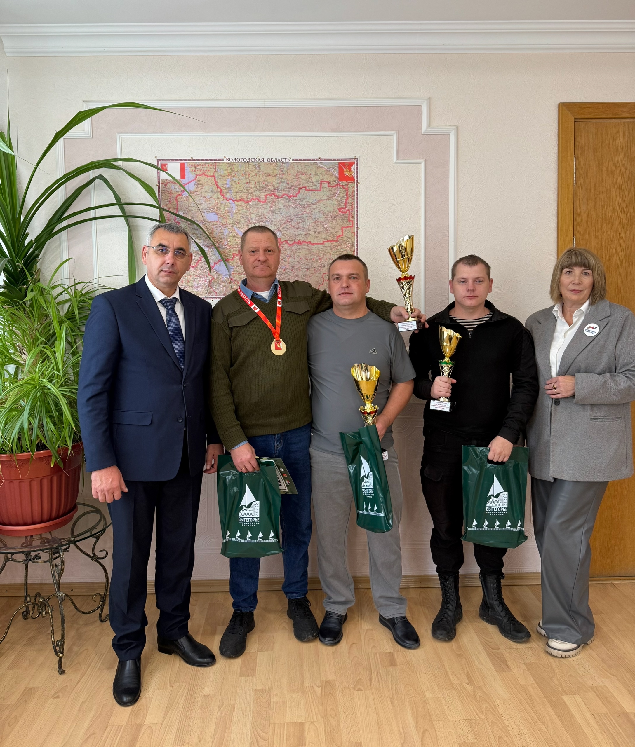 Временно исполняющий полномочия руководителя администрации Вытегорского муниципального района Иван Абрамов провел торжественный прием, чтобы лично поздравить победителей. На фото слева направо Иван Абрамов, Андрей Ипатов, Павел Марков, Василий Соколов и Татьяна Яснова.